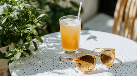 A stylish pair of sunglasses on a sunlit patio table, with plants and a fresh drink beside them, vibrant atmosphere --chaos 30 --ar 16:9 --v 6.1 Job ID: 1f723bfd-9d31-4c97-afb8-006cc3211fc2
