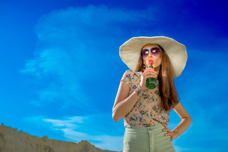 Young woman drinking from the bottle on the sky background on the summer