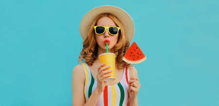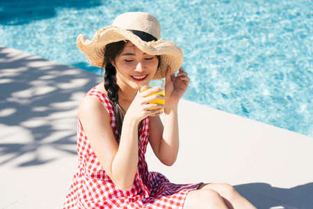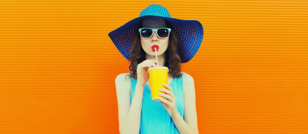Beautiful woman wearing bikini and hat drinking orange juice