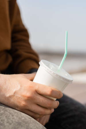 Young woman with tasty cocktail in plastic cup outdoors