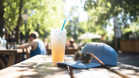 Baseball cap beside a cold drink and sunglasses on a sunny patio table
