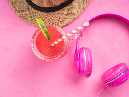 Straw hat, smoothie and headphones on pink