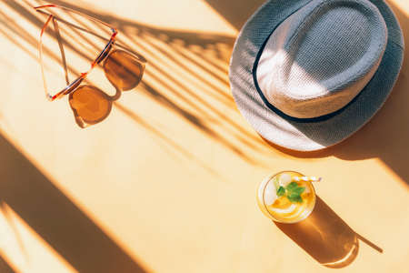 Summer holidays vacation concept background, hat, sunglasses, iced drink (lemonade, mojito), white wooden background copy space