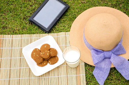 milk and cookies on bamboo mat with tablet and beautyful hat on green grass background