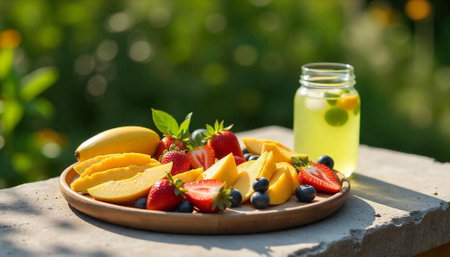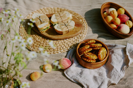 Fresh fruits and cookies arranged beautifully for a summer picnic display on a sunny day outdoors