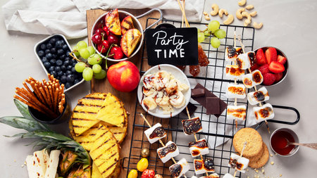 Assortment of grilled sweets and fruits. Summer bbq table. Pineapple, peach, banana, marshmallow, strawberry, blueberry on light background. Top view