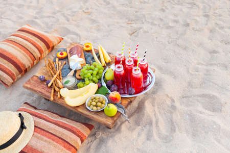 Picnic on the beach at sunset in the style of boho. Concept outdoors evening healthy meal with fruit and juice.