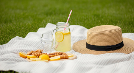 a refreshing picnic scene with lemonade, cookies, and a hat on a white blanket in the grass.