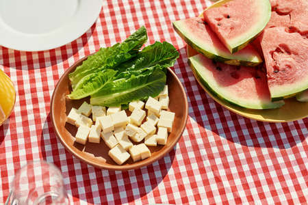 Summer picnic with watermelon. Sliced juicy watermelon and disposable eco-friendly paper tableware