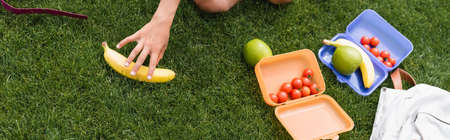 Cropped view of schoolchild taking banana near backpack and lunchboxes on lawn, banner
