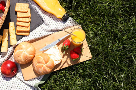 Picnic blanket with juice and snacks on green grass, flat lay. Space for text