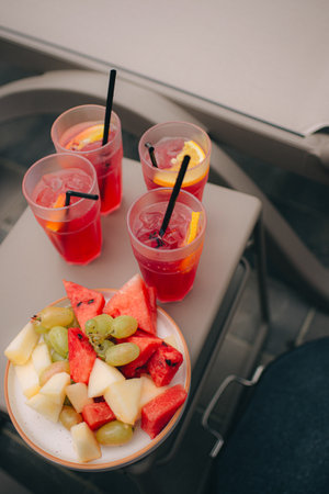 Close-up shot of a fruit cocktail and a food tray outdoors with the swimming pool in an out of focus background.