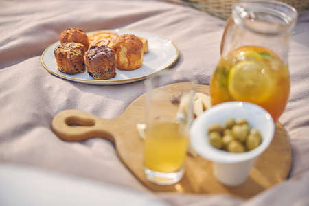 Picnic on the bank of a river. Blanket with pillows and food on a wooden bridge. Bottle of strawberry and lemon smoothie, soda glasses with straws, herb croissants, sweet cakes and fresh strawberries