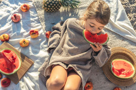 Concepts of food at summer season. White blanket with various summer fruits, including watermelon, cherries, raspberries, and lemon, top view. Inspiration of garden picnic on weekend