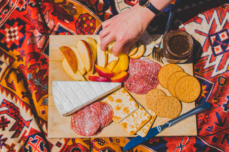 woman hand serving cake on picnic table with food served outdoors on the fabric picnic cloth. Close up, top view. Fresh vegetables and fruits, grapes, orange, raspberry, cheese sticks, cookies and cake for dessert.