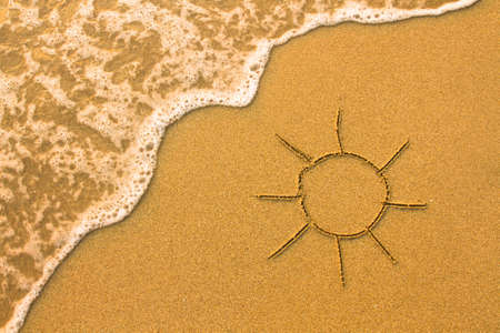 Beach sand surface with simple sun drawn on it. Summer background.