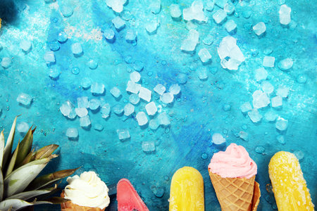 Colorful ice cream pattern on pastel blue background. Creative minimal summer flat lay.