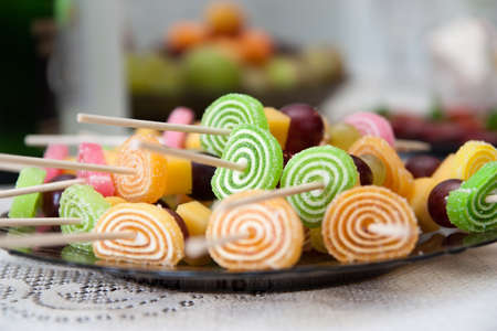 Various fruit jelly candies on plate on gray concrete background. close up, copy space.
