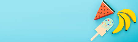 top view of paper watermelon, bananas and ice cream with sprinkles on blue background, panoramic shot