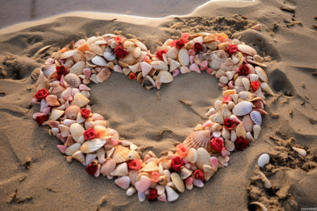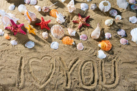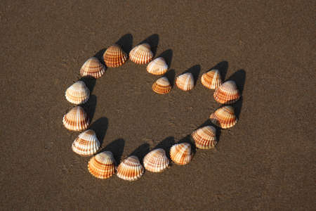 Sea shells and heart hand drawn on a sandy beach