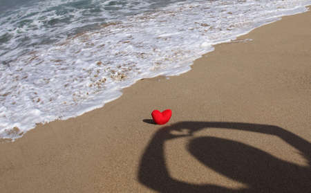 Red heart on a sandy beach concept Valentine day