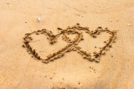 Two lovers hearts drawn on the sand to the sea.