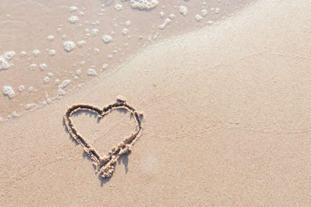 One Heart Drawn in the Sand on a Beach.soft wave of the sea.Real romantic love. true love.