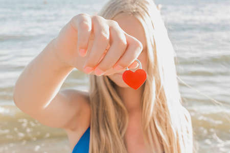A young blonde girl holds in her hand a small red heart in the form of a castle against the sea. Sign and symbol of love concept.