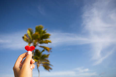 Hand holding small heart on a background of two palm trees and blue sky.