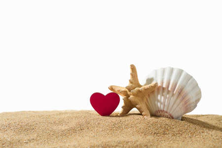 Composition on a marine theme on a white background. White shell and starfish with a small heart on the sand. Studio photo.