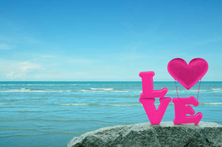 Pink love alphabet and fabric heart ballon on rock over tropical sea and blue sky, Happy valentines day concept