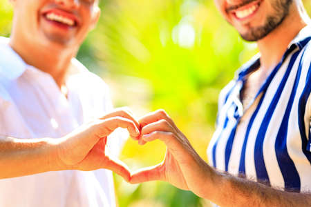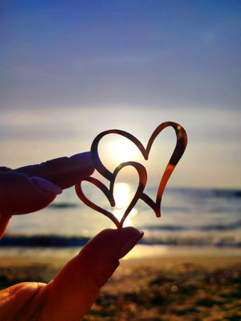 Bright sunset and hands of a man forming a heart shape silhouette on natural oudoors abstract background. Close up on emotional human feeling over sunny seascape shore leisure travel landscape