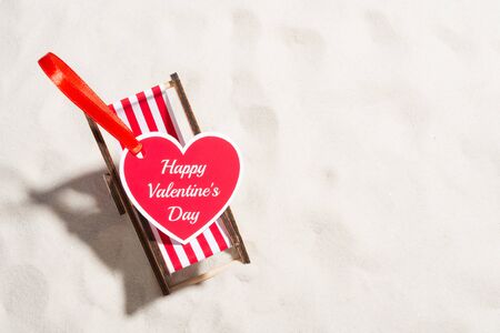 Heart-shaped Valentine's day greeting card and small deckchair on the sand.