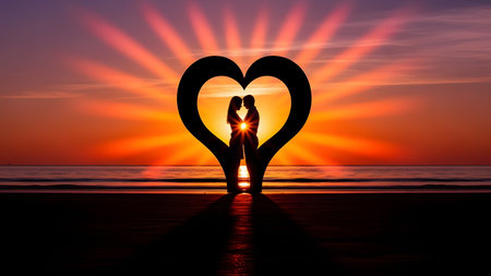 Silhouettes of a young couple, hands show the shape of the heart against the backdrop of the sunset over the sea