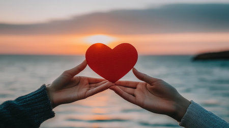 Red heart in the palm of your hand against the backdrop of the reflections of the sea. selective focus.