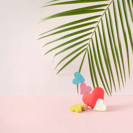 Colorful hearts with tropical fuel on a pastel pink background. Creative love idea. Minimal concept with copy space.