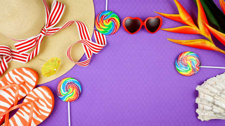 Summer vacation theme flatlay overhead with sunhat, lollipops, ice creams and sunglasses on purple background.