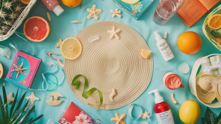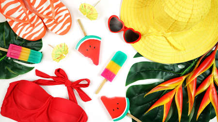 Summer vacation resort theme flat lay in bright summery colors.