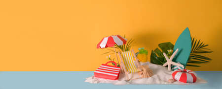 Summer concept and accessories(shells, starfish, coconut leaf)with sandy beach on yellow background.