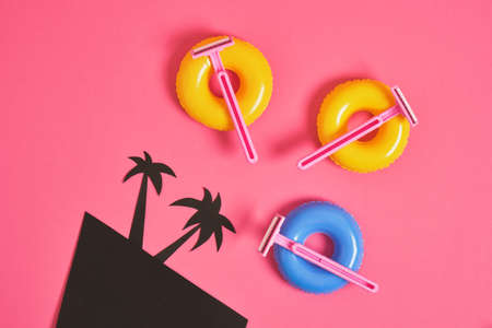 pink disposable razors on small toy balloons, black cardboard palms on pink background, body hair removal before beach vacation concept
