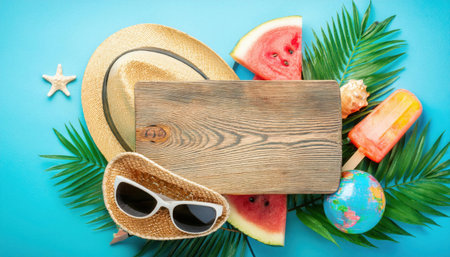 Colorful tropical beach elements surround a wooden sign perfect for a summer sale. Straw hat, watermelon, and sunglasses add to the festive mood, inviting vacation vibes.