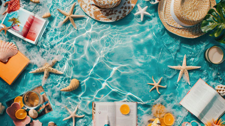 On the beach, a hat, sunglasses, seashells, starfish, and photos are scattered on the sand. The aqua water creates a stunning landscape for leisure and fun events AIG50