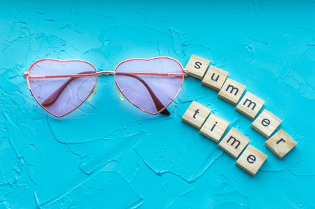 Pink heart-shaped sunglasses on a blue background. Concept summer. Minimalism. The word summer time.