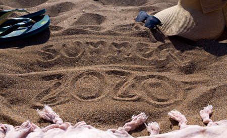 summer 2020 written in the sand with towel flip flops and summer items on sunny day