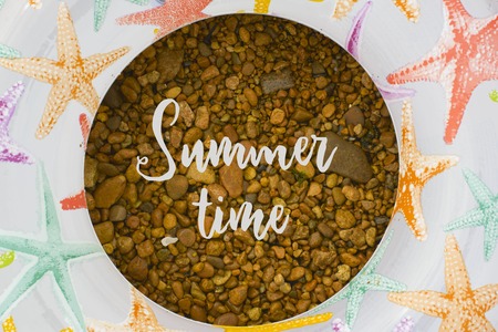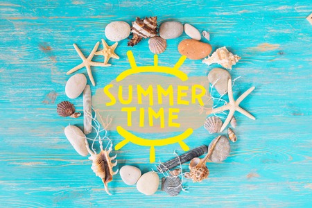 summer time text in circle of sea shells. title concept