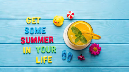 A vibrant summer-themed arrangement featuring the words Summer Stories surrounded by citrus fruits, sunglasses, and shells on a wooden surface. Perfect for capturing summer vibes!