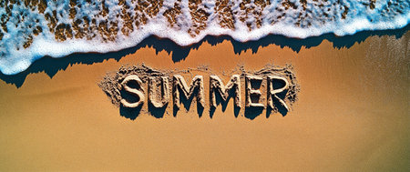 Summer written in sand on a beach with gentle waves lapping at the shore creating a serene and relaxing atmosphere perfect for vacation and summer fun concept