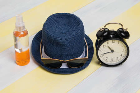 a hat, clock and the words time to summer vacation on a light blue background with copy - up text