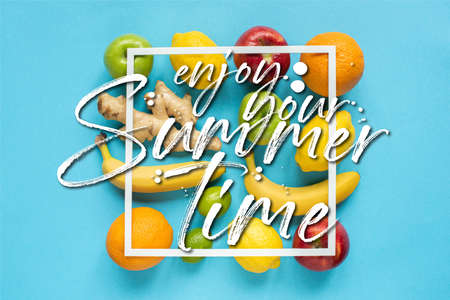 top view of ripe whole fruits and square frame on blue background, enjoy your summertime illustration