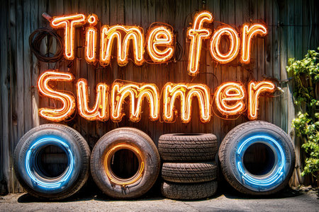 A bright neon sign reads 'Time for Summer', showcased in an auto shop next to tires. The colorful display captures summer fun and excitement, perfect for promotions.
